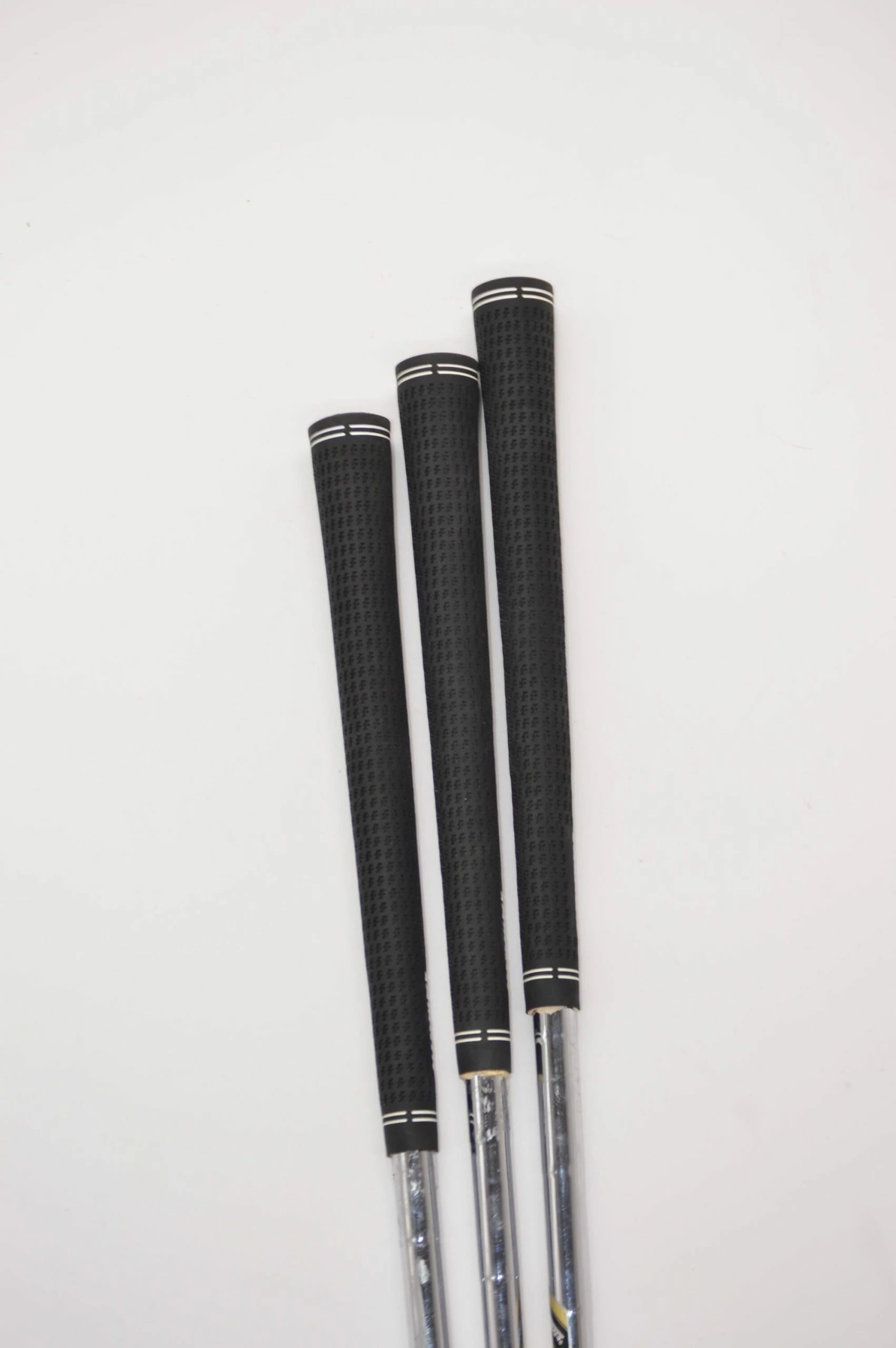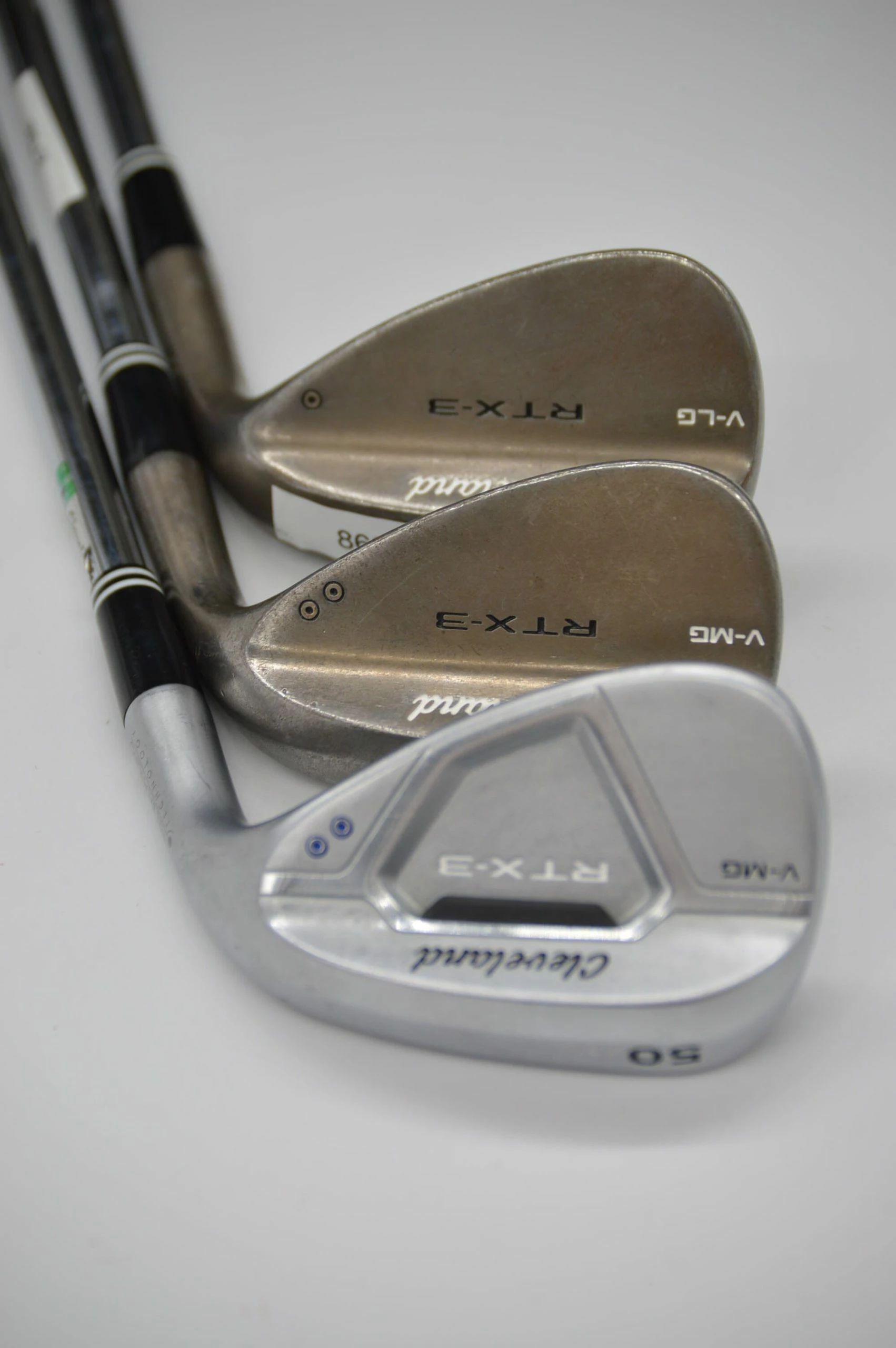 Set includes 50, 54, 58 Degrees wedges. Wedges are in good condition (some cosmetic wear, but nothing that affects performance in any way). Shafts are True Temper Dynamic Gold in S Flex with Lamkin Crossline grips. 50 degree wedge is a RTX-3 V-MG Tour Satin Model in wedge flex. 54 degree is a V-MG model. 58 degree wedge is a V-LG model.
