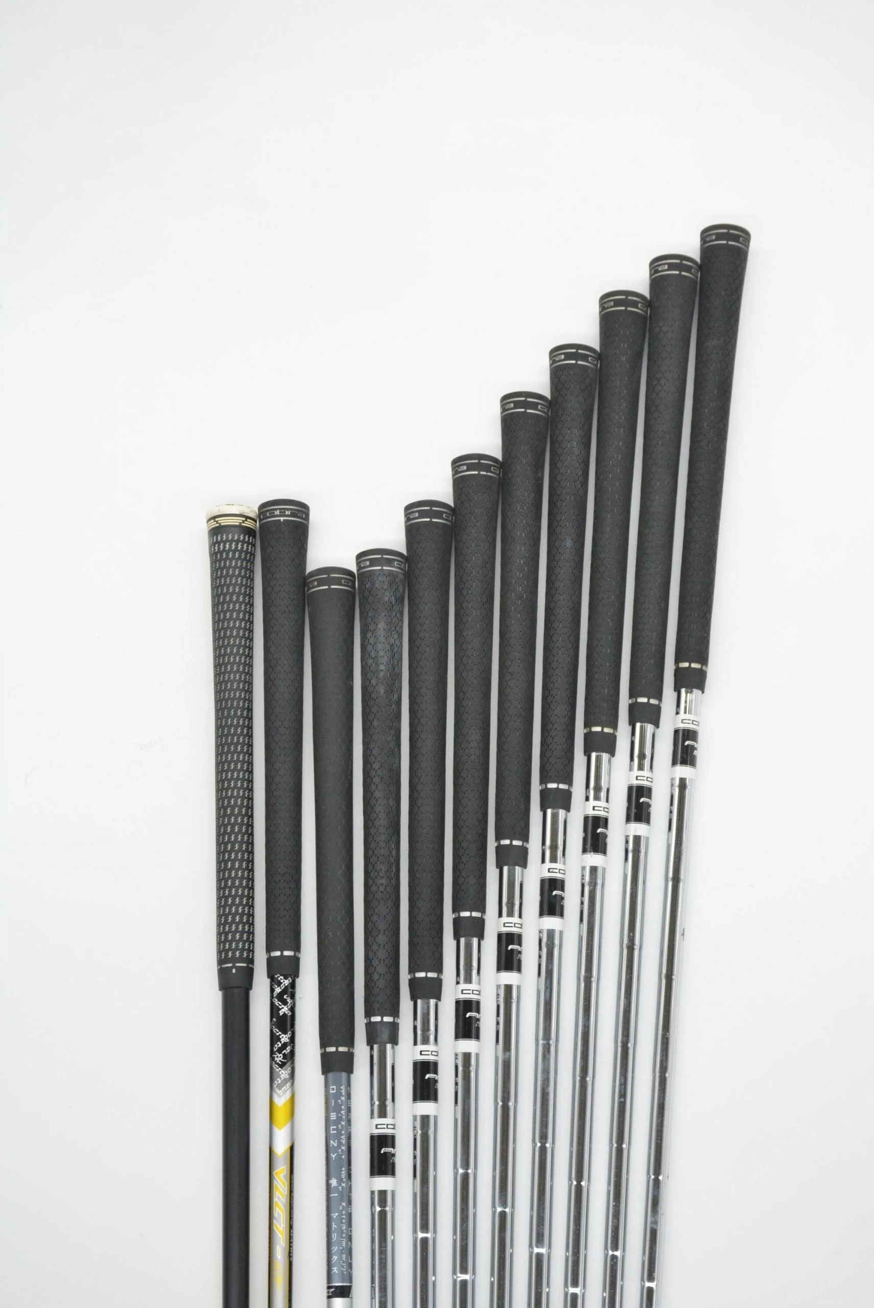 Set includes a Cobra King F8+ 11 degree Driver, a Cobra Fly-Z Fairway 3-4 Wood, a Cobra King F6 20.5 degree Hybrid, and Cobra Amp Max Irons 4-SW. Irons are in good condition with light wear to the heads and faces, with stock shafts in S-flex and stock Cobra grips.