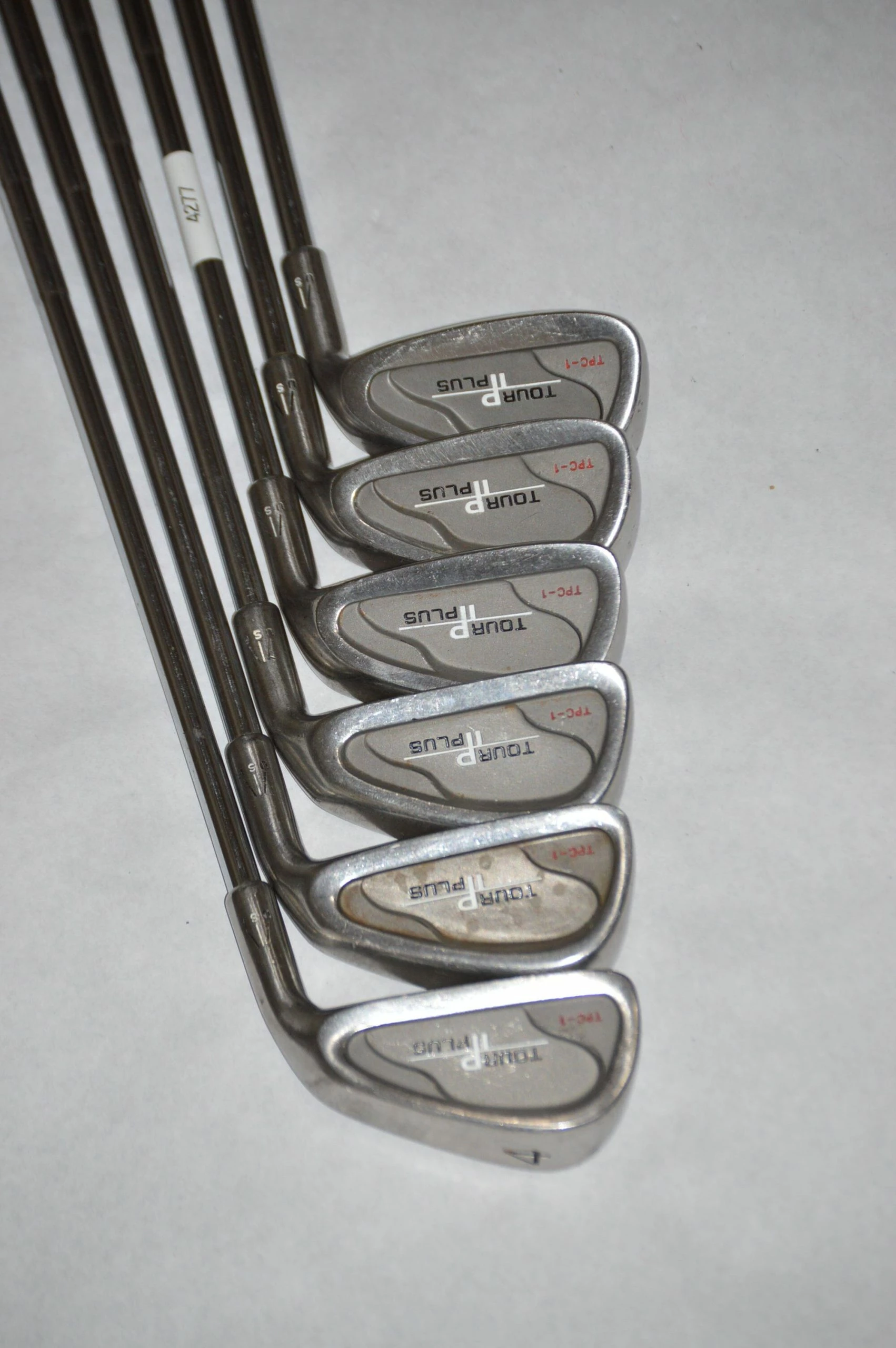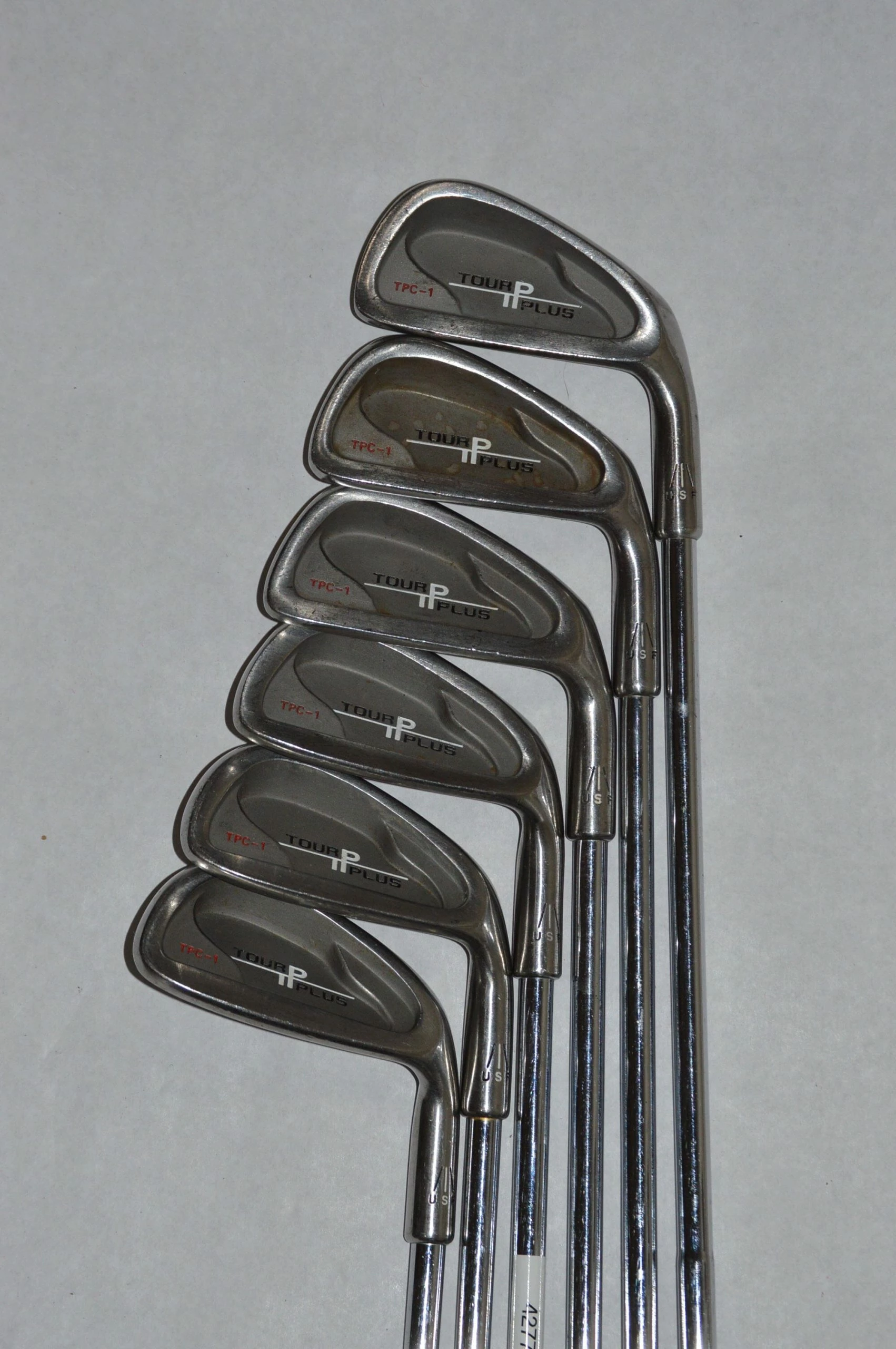 Iron set includes Tour II Plus TPC-1 4,5,7-PW (missing 6 iron). Irons are in good condition with light wear to club heads and faces. Shafts are True Temper Dynamic, steel, R Flex with Lamkin Perma Tac Grips. Club lengths are standard.